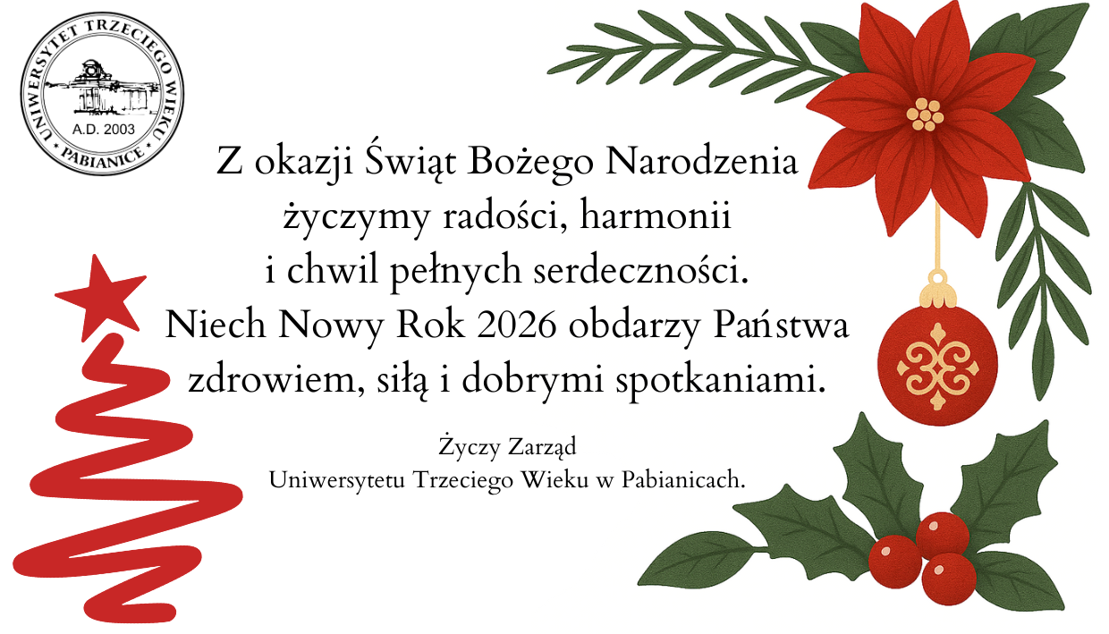 Z okazji Świąt Bożego Narodzenia życzymy radości, harmonii i chwil pełnych serdeczności. Niech Nowy Rok 2026 obdarzy Państwa zdrowiem, siłą i dobrymi spotkaniami. Życzy Zarząd Uniwersytetu Trzeciego Wieku w Pabianicach.